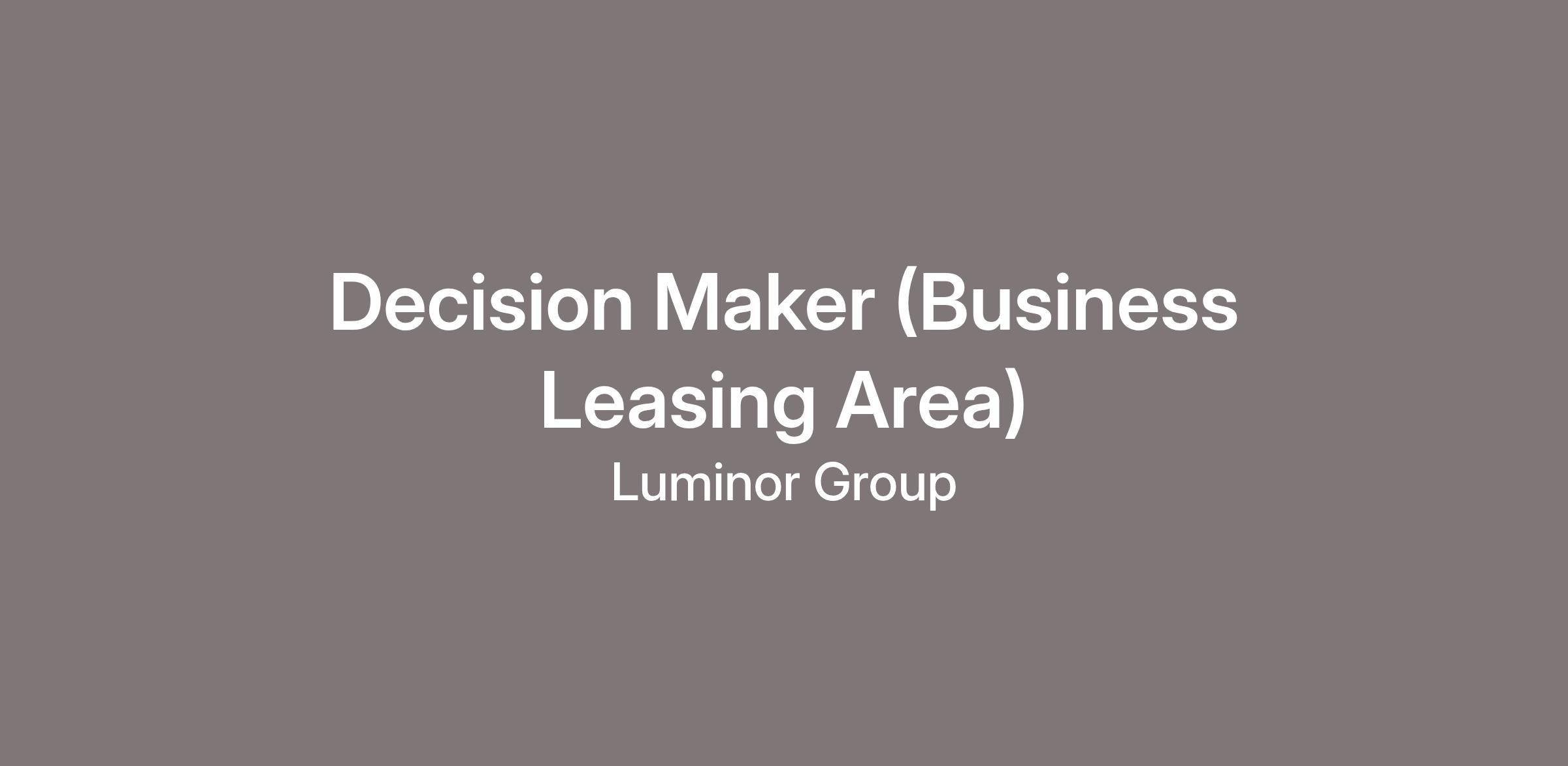 Decision Maker ensures customer needs, business targets and risk appetite-oriented approach to processes and makes decisions for business leasing. Follows Luminor’s values – collaboration, focus and curiosity in daily work life with colleagues and customers.